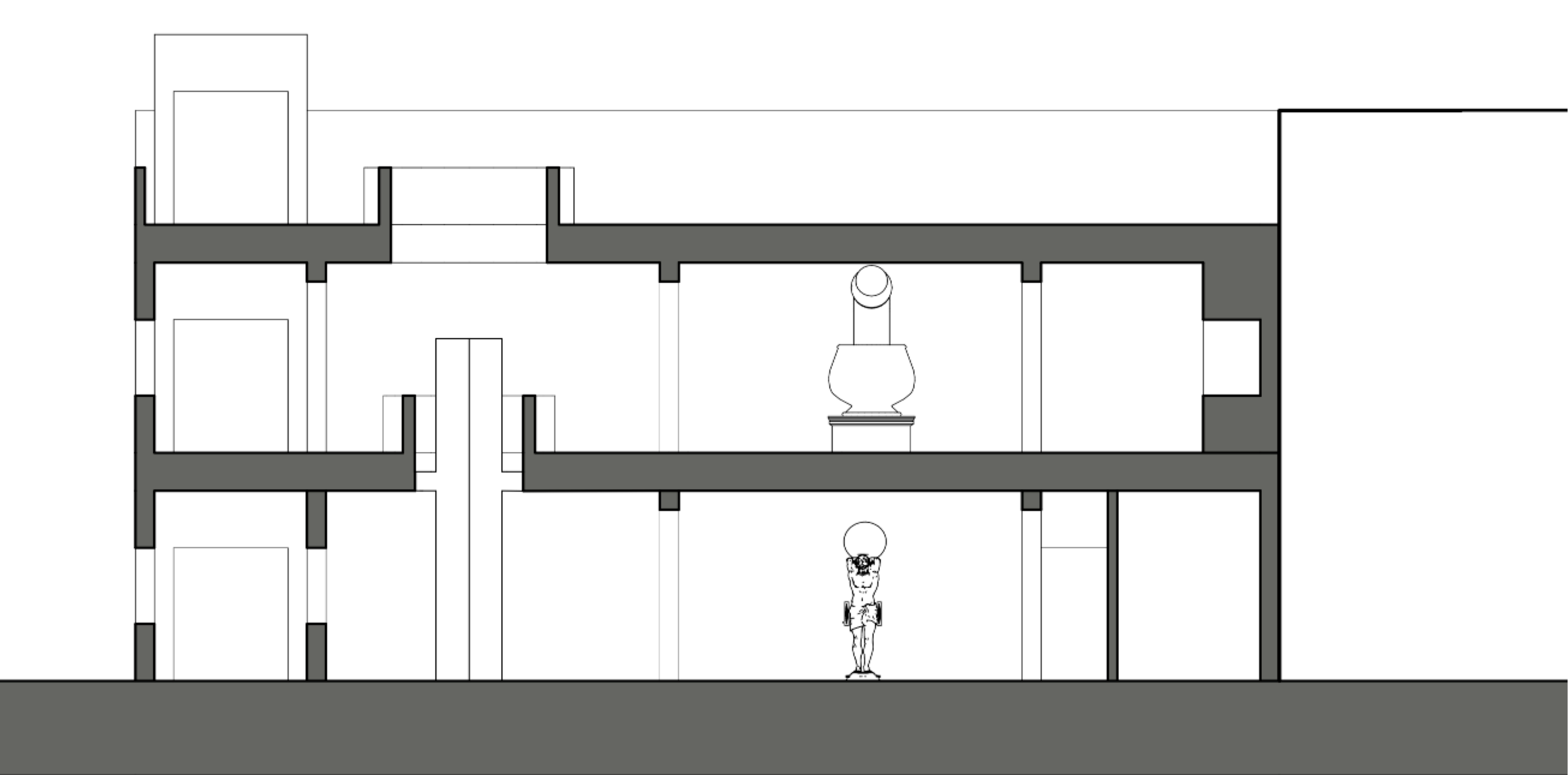 The gallery design is structured around a central focal point, as highlighted in the parti diagram, establishing a strong axial organization that guides spatial hierarchy and movement. The rhythm diagram reveals a modular approach, organizing spaces into structured bands that create a consistent yet engaging visitor experience. Circulation is dynamic, with a primary zig-zag movement path (red) complemented by a strong vertical axis (blue), ensuring smooth transitions between key spaces. The hierarchy diagram effectively distinguishes spatial importance, with primary exhibition areas in bold red, secondary transitional spaces in pink, and tertiary support functions in blue, optimizing both functionality and wayfinding.